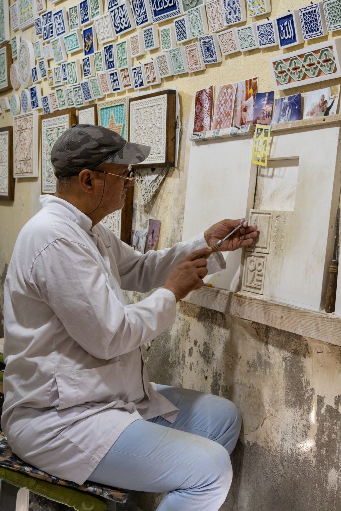 Dans ces ateliers confinés, éclairés par de simples ampoules nues, les gestes se répètent depuis des générations. Le dinandier martèle inlassablement ses plateaux de cuivre, créant ces motifs géométriques complexes qui orneront les riads. Le maroquinier assemble à la main babouches et sacs selon des techniques inchangées, utilisant encore les outils légués par son père.