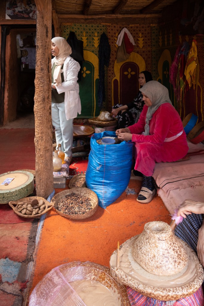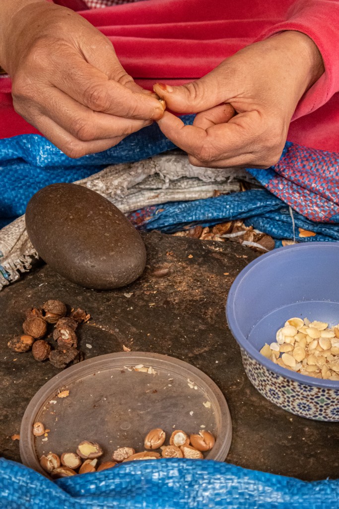 La récolte s’effectue entre juin et septembre. Les femmes berbères récoltent les fruits, les sèchent au soleil, puis extraient manuellement les noix. Chaque noyau contient un à trois amandons qu’elles brisent délicatement à l’aide de pierres spéciales. Il faut 30 kilogrammes de fruits pour obtenir un litre d’huile après 20 heures de travail manuel, expliquant ainsi son prix élevé.