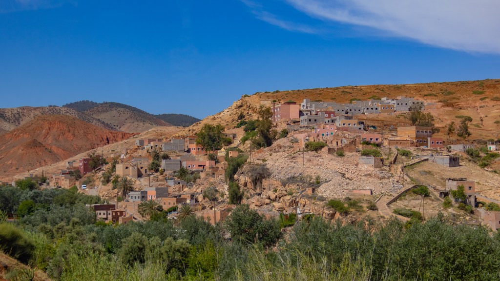 Le village berbère de Tahanaout marque la transition entre la plaine et la montagne. Ses maisons traditionnelles s’accrochent aux premiers contreforts de l’Atlas, témoignant d’une architecture parfaitement adaptée au climat semi-aride. Les traces du séisme de septembre 2023 restent visibles dans certains quartiers et village alentour rappelant la vulnérabilité de ces constructions ancestrales face aux mouvements telluriques. L’hospitalité berbère s’exprime pleinement dans les maisons traditionnelles où les familles accueillent les visiteurs autour du thé à la menthe. Cette cérémonie du thé, rituel social fondamental, se déroule selon un protocole précis transmis de génération en génération. Les femmes du village perpétuent également la fabrication artisanale de l’huile d’argan.
