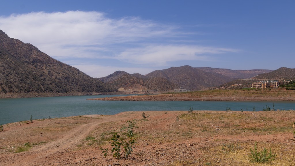 Construit dans les années 1990, le barrage Wirgane El Haouze illustre les défis hydriques du Maroc contemporain. Cette infrastructure, destinée à alimenter Marrakech en eau potable et à irriguer les cultures de la plaine, révèle aujourd’hui les effets du changement climatique.